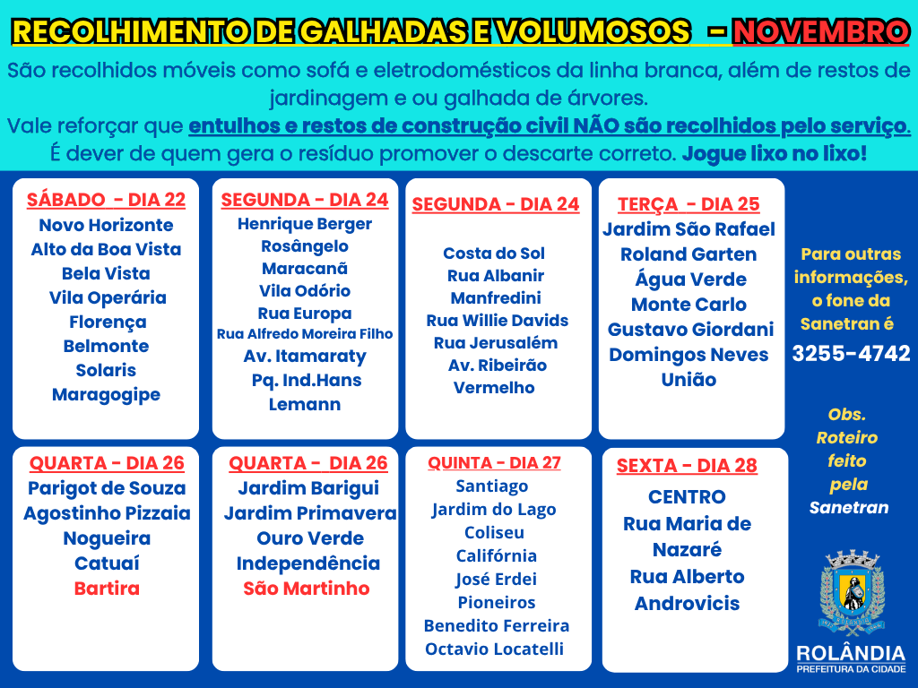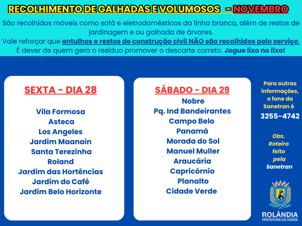 As Secretarias de Serviços Públicos e de Agricultura e Meio Ambiente informam que a empresa terceirizada que presta serviço ao município, a SANETRAN, passa recolhendo volumosos deixados na calçada (móveis como sofá e eletrodomésticos da linha branca), além de restos de jardinagem e ou galhada de árvores.