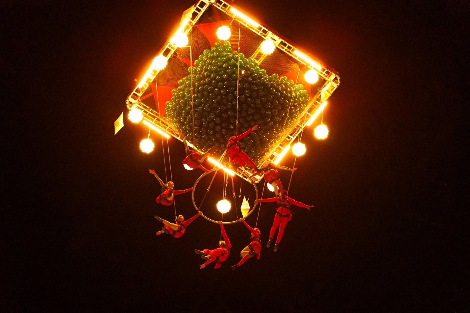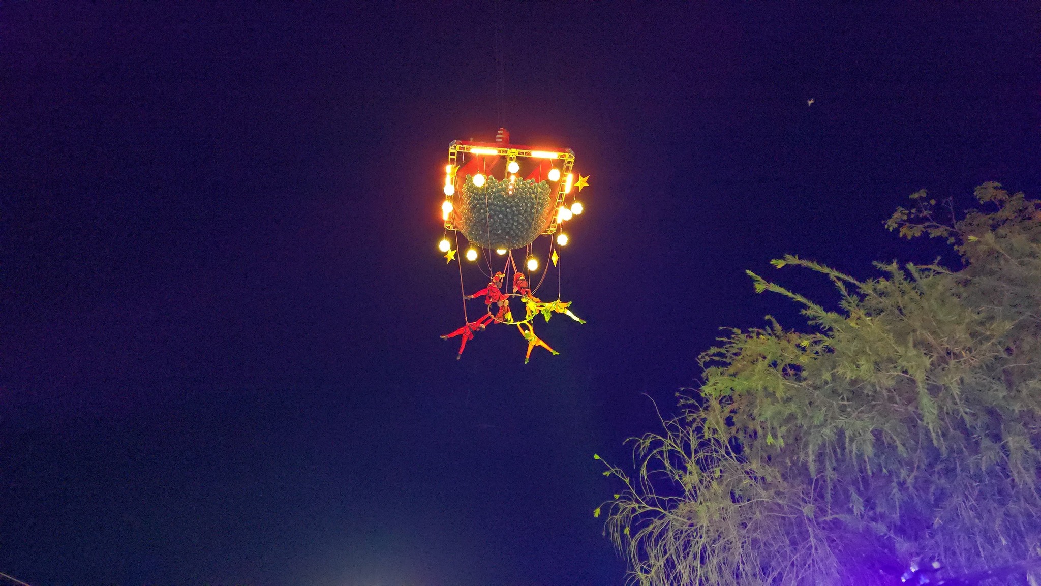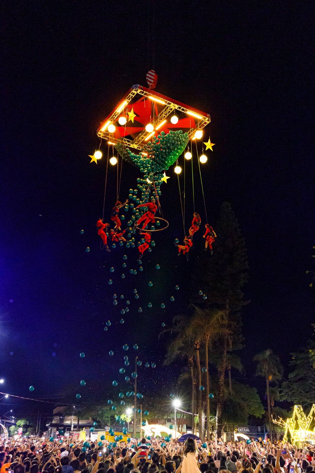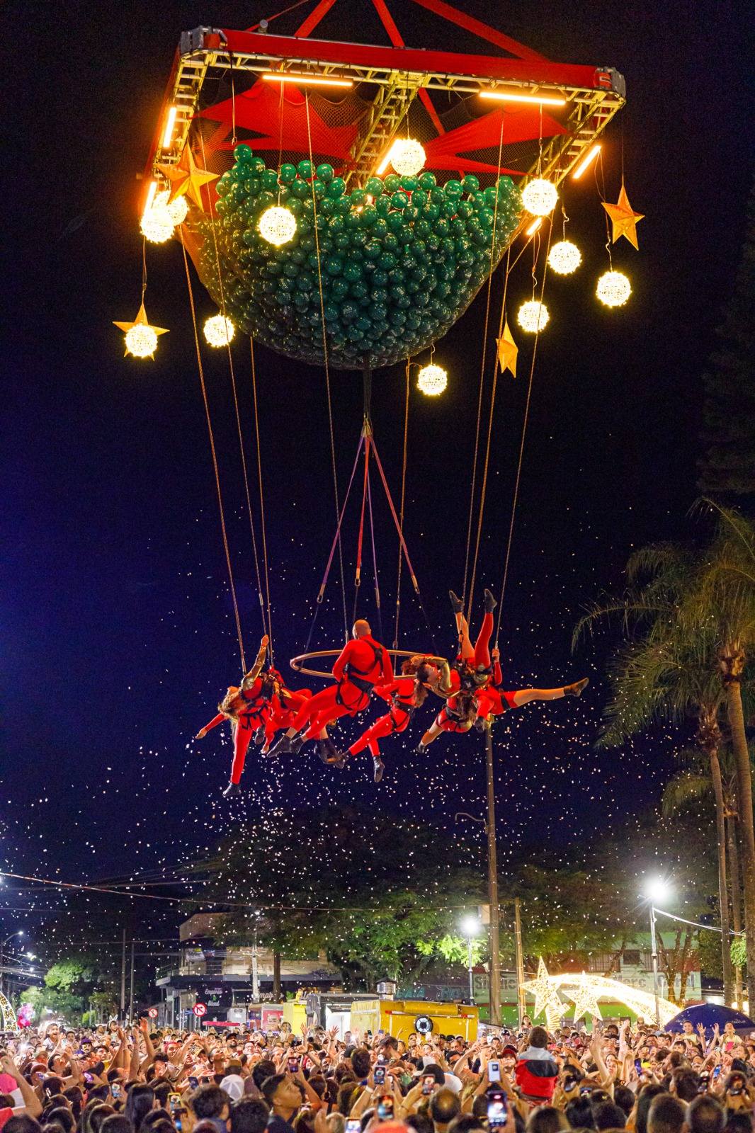 Içados por um guindaste, 10 acróbatas aéreos dançaram e apresentaram lindas coreografias, a uma altura de 40 metros do solo, enquanto músicas natalinas eram cantadas pelo Coral Ébano. Eles interagiram com o público e distribuíram doces e bolas.