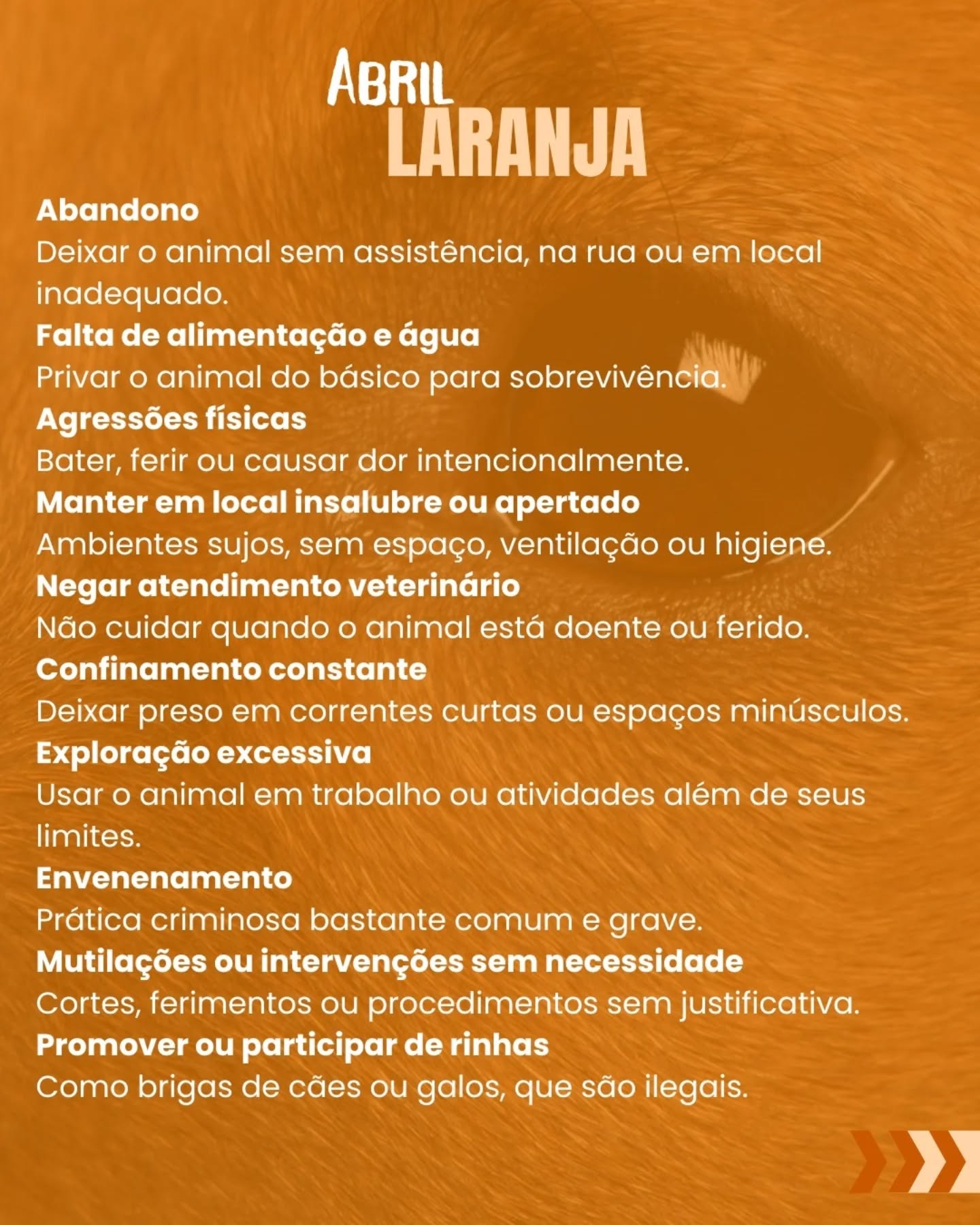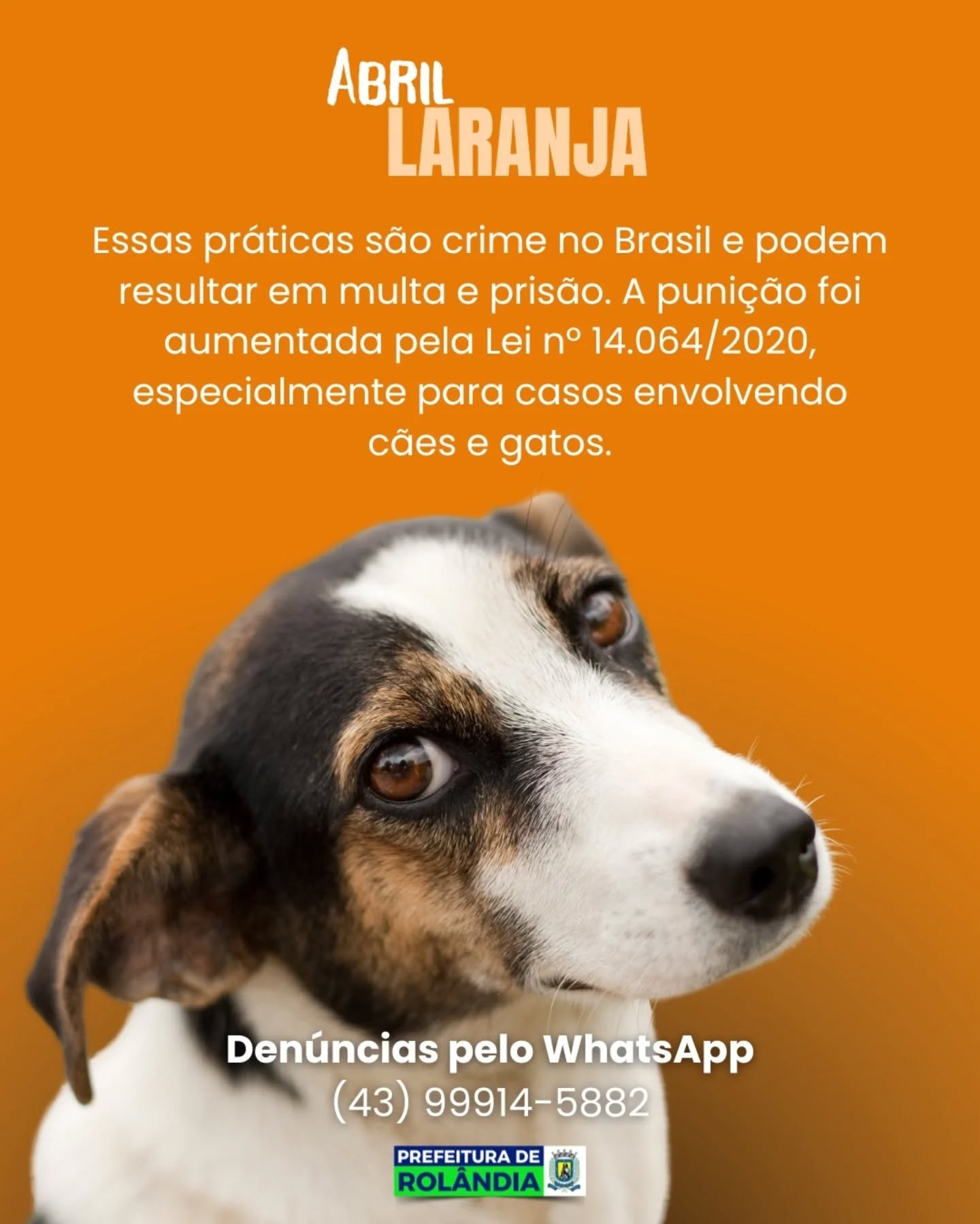 A secretaria de Agricultura e Meio Ambiente (SEMMA) destaca que o "Abril Laranja" é a campanha internacional de conscientização contra a crueldade e maus-tratos a animais, dedicada a prevenir o abandono e violência.