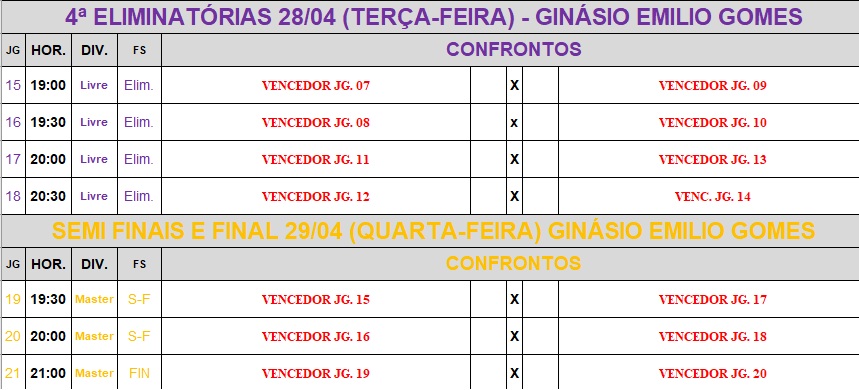 Confira em anexo as tabelas com os dias e horários das partidas dessas modalidades.