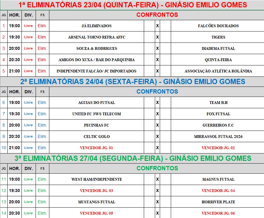 Agora, com o regulamento e tabela definidos, começam as eliminatórias do futsal!