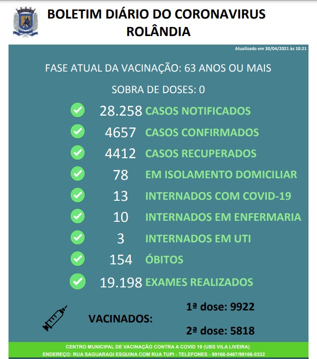 A Secretaria Estadual de Saúde vai repassar para Rolândia 1.815 doses de vacina contra a covid-19. A cidade, na próxima segunda, dia 3 de maio, vai ser contemplada com 1.775 doses de vacinas Covidshield (mais conhecida como vacina de Oxford, resu...