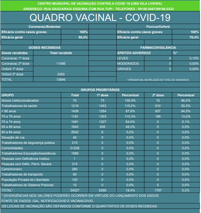 A Secretraia de Saúde informa que o Drive Thru de hoje vacinou 380 idosos com 77 anos ou mais contra a covid-19! Amanhã, quinta-feira, das 8h às 12h, será a vez da população com 76 e 75 anos.Apenas segunda dose para quem se imunizou anteriorm...