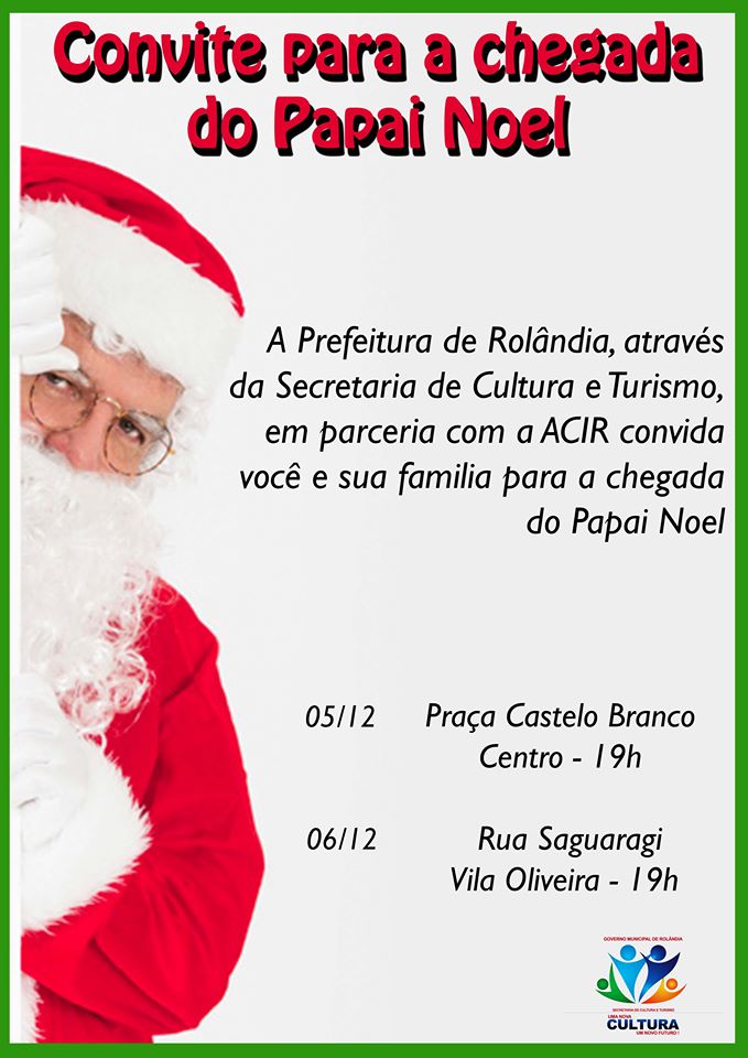 A Secretaria de Cultura e Turismo, em parceria com a ACIR, divulga a programação do NATAL 2019. O Papai Noel vai chegar em dois momentos: 05/12 – 19h Na praça Castelo Branco, centro (quinta) 06/12 – 19h Na Vila Oliveira – Rua Saguaragi ...