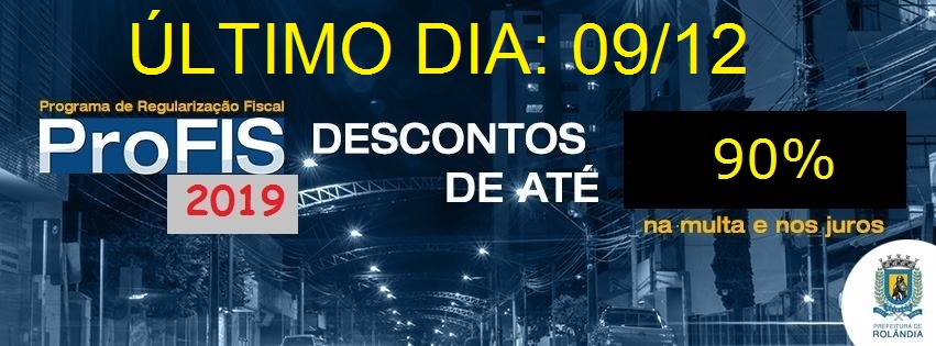 A Prefeitura de Rolândia informa que o Programa de Regularização Fiscal (Profis) 2019 está em vigor, agora com descontos de até 90% em multas e juros (para débitos de até 31/12/2018). O contribuinte pode aderir ao Profis até o dia 15 de ag...