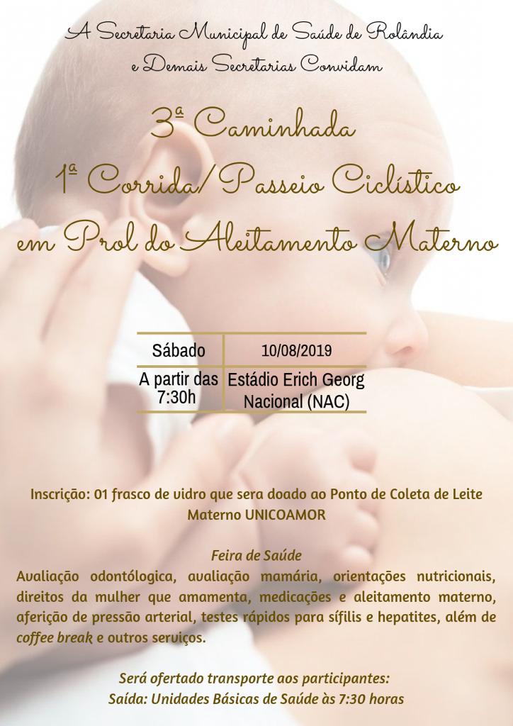 A Secretaria Municipal de Saúde e demais Secretarias do município de Rolândia promoverão no dia 10 de agosto (sábado) a partir das 7h30 um grande evento em prol ao Aleitamento Materno no Estádio Erich Georg. O mês de agosto é conhecido nac...