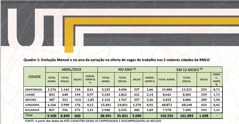 Dados do Cadastro Geral dos Empregados e Desempregados (CAGED), do Ministério do Trabalho e Emprego levantados por uma pesquisa da Universidade Tecnológica Federal do Paraná (UTFPR) Campus Londrina, aponta que Rolândia ficou ...