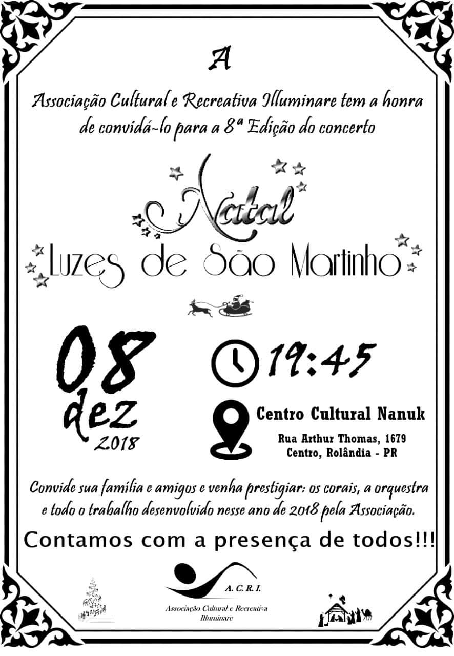 A Associação Cultural e Recreativa Illuminare (ACRI), do Distrito de São Martinho, convida toda a população de Rolândia e região para o "8º Concerto - Natal Luzes de São Martinho", que será realizado no Centro Cultural Nanuk,...