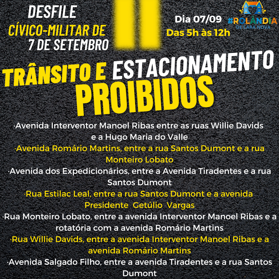 DESFILE CÍVICO-MILITAR IMPEDE O TRÂNSITO E O ESTACIONAMENTO EM VIAS DO CENTRO DURANTE A MANHÃ DE QUINTA-FEIRA, SETE DE SETEMBROAs secretarias de Educação e de Serviços Públicos informam que, devido ao desfile cívico-militar, de quinta-feira, ...