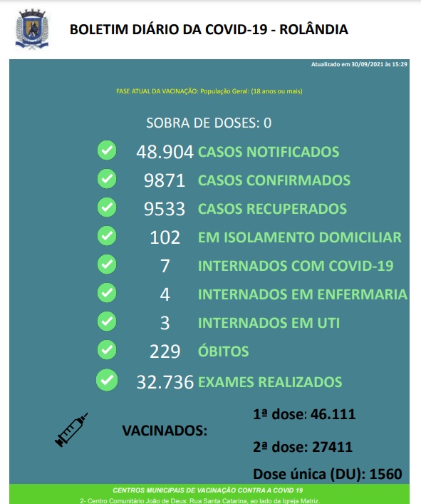 A Secretaria de Saúde informa que a ação de repescagem de vacinação contra a covid-19, em primeira dose, para pessoas com 18 anos ou mais, no Centro de Pastoral João de Deus, vacinou 2.127 rolandenses, nesta quinta, dia 30 de setembro.#rolandia...