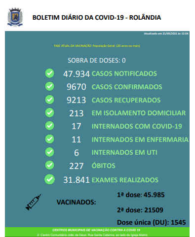 A Secretaria Municipal de Saúde informa sobre casos de covid-19. Nas últimas horas foram registrados 25 pacientes curados e 20 contaminações. Rolândia tem atualmente 230 pacientes com covid-19: 213 em isolamento domiciliar e 17 internados em ...