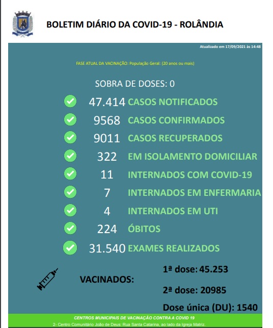 BOLETIM COVID-19 - 17/09/2021A Secretaria Municipal de Saúde informa sobre casos de covid-19.Nas últimas horas foram registrados 103 pacientes curados e 109 contaminações.Rolândia tem atualmente 333 pacientes com covid-19:322 em isolamento domic...