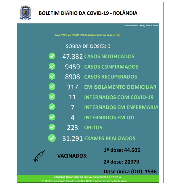 BOLETIM COVID-19 - 16/09/2021A Secretaria Municipal de Saúde informa sobre casos de covid-19.Nas últimas horas foram registrados 46 pacientes curados e 39 contaminações.Rolândia tem atualmente 328 pacientes com covid-19: 317 em isolamento domici...