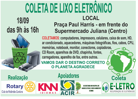 É NESTE SÁBADO!COLETA DE LIXO ELETRÔNICOA Secretaria de Agricultura e Meio Ambiente comunica que, em realização do Rotary Club de Rolândia-Caviúna, haverá coleta de lixo eletrônico no dia 18/09/2021, sábado, das 9h às 16h, na Praça Paul H...
