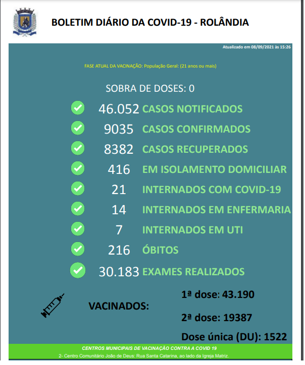 BOLETIM COVID-19 - 08/09/2021 A Secretaria Municipal de Saúde informa sobre casos de covid-19.Nas últimas horas foram registrados 116 pacientes curados e 133 contaminações.Rolândia tem atualmente 437 pacientes com covid-19: 416 em isolamento ...