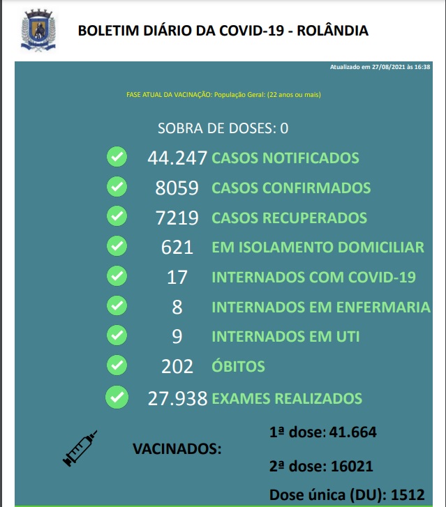 BOLETIM COVID-19 - 27/08/2021A Secretaria Municipal de Saúde informa sobre casos de covid-19: foram registrados 140 pacientes curados e 81 contaminações.Rolândia tem atualmente 638 pacientes com covid-19: 621 em isolamento domiciliar e 17 interna...