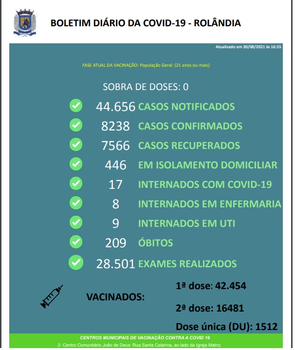 BOLETIM COVID-19 - 30/08/2021A Secretaria Municipal de Saúde informa sobre casos de covid-19: foram registrados 347 pacientes curados e 179 contaminações. Rolândia tem atualmente 463 pacientes com covid-19: 446 em isolamento domiciliar e 1...