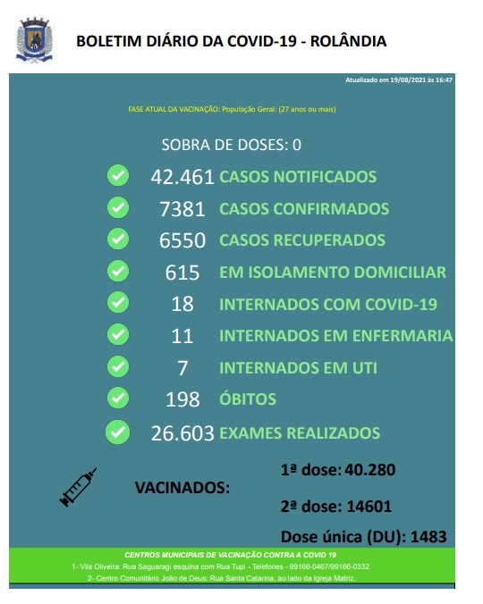 BOLETIM COVID-19A Secretaria Municipal de Saúde informa sobre casos de covid-19 nas últimas horas: foram registradas 127 contaminações e 62 pacientes curados.Rolândia tem atualmente 633 pacientes com covid-19: 615 em isolamento domiciliar e 18 i...
