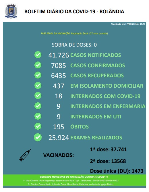 BOLETIM COVID-19A Secretaria Municipal de Saúde informa sobre casos de covid-19 nas últimas horas: foram registradas 93 contaminações e 12 pacientes curados.Rolândia tem atualmente 455 pacientes com covid-19, sendo 437 em isolamento domiciliar e...