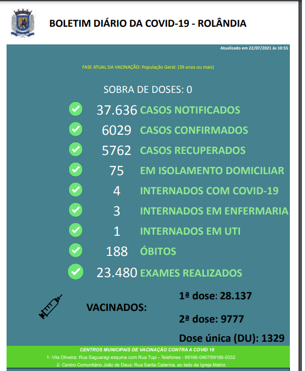 BOLETIM COVID-19A Secretaria Municipal de Saúde informa sobre casos de covid-19 nas últimas horas: foram registradas 12 contaminações e 19 pacientes curados. Rolândia tem atualmente 79 pacientes com covid-19, sendo 75 em isolamento domiciliar e ...