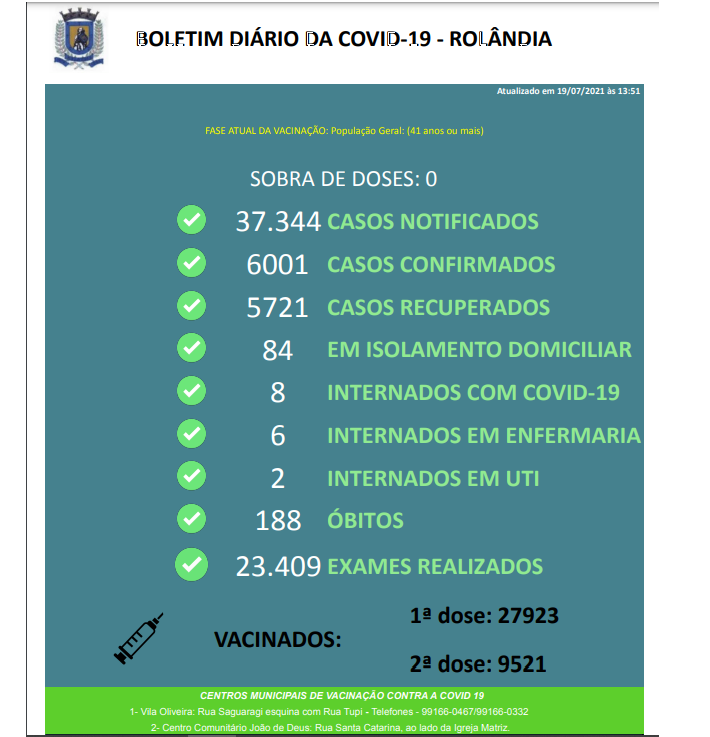 A Secretaria Municipal de Saúde informa sobre casos de covid-19 nas últimas horas: foram registradas 29 contaminações e 49 pacientes curados. Rolândia tem atualmente 92 pacientes com covid-19, sendo 84 em isolamento domiciliar e 8 internados em ...