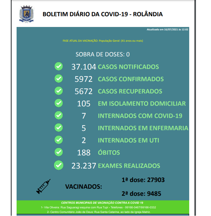 BOLETIM COVID-19A Secretaria Municipal de Saúde informa sobre casos de covid-19 nas últimas horas: foram registradas 11 contaminações e 18 pacientes curados. Rolândia tem atualmente 112 pacientes com covid-19, sendo 105 em isolamento domiciliar ...