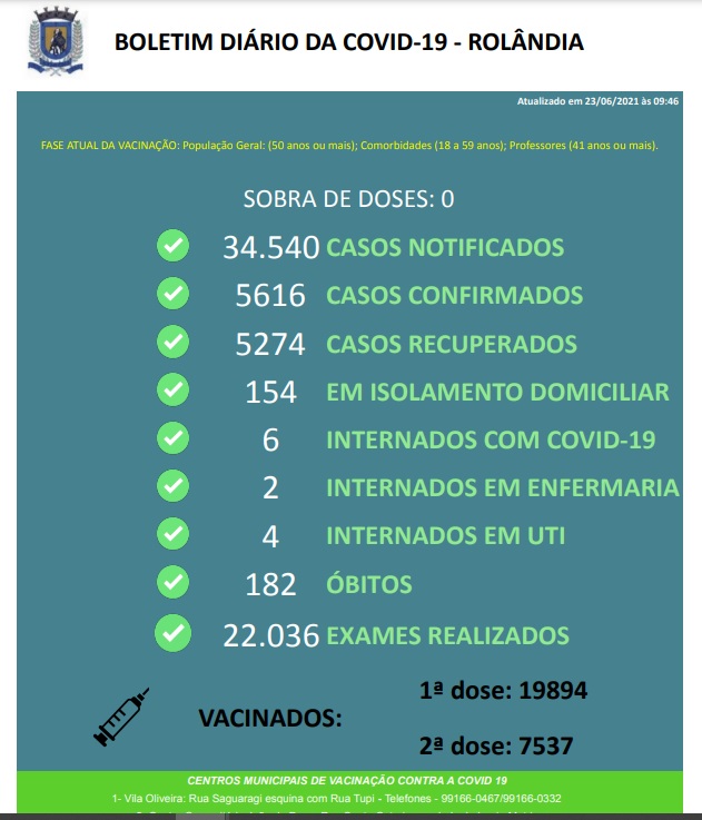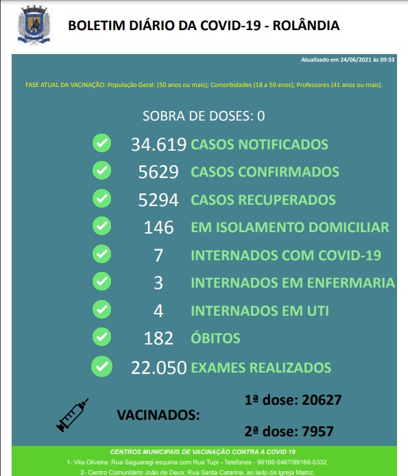QUADRO VACINAL CONTRA A COVID-19: ROLÂNDIA TEM QUASE 20 MIL VACINADOS, AO MENOS COM UMA DOSE...