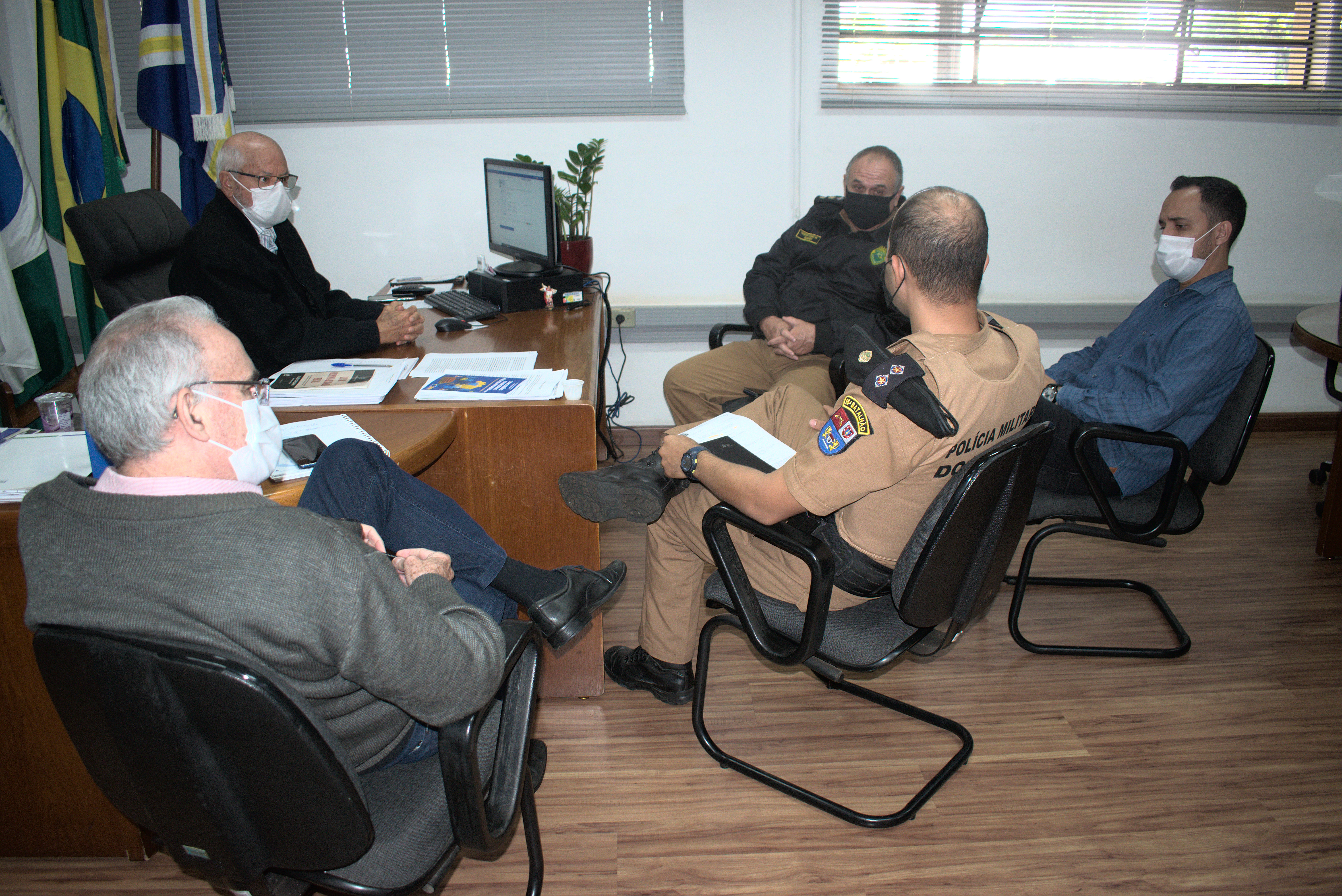 O Prefeito Ailton Maistro, o Chefe de Gabinete Sérgio Domingues e o Secretário de Assistência Social, Diego Silva, receberam no gabinete, o comandante do 15º Batalhão da Polícia Militar, Tenente-coronel Roberto e o Tenente Anderson, para disc...
