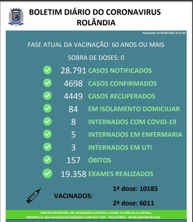 A Secretaria Estadual de Saúde (SESA) comunicou o Município, por meio da Secretaria de Saúde, que na tarde desta quinta-feira, dia seis de maio, vai repassar 2.125 doses de vacina contra a covid-19 para Rolândia, com essa disposição: COVID S...