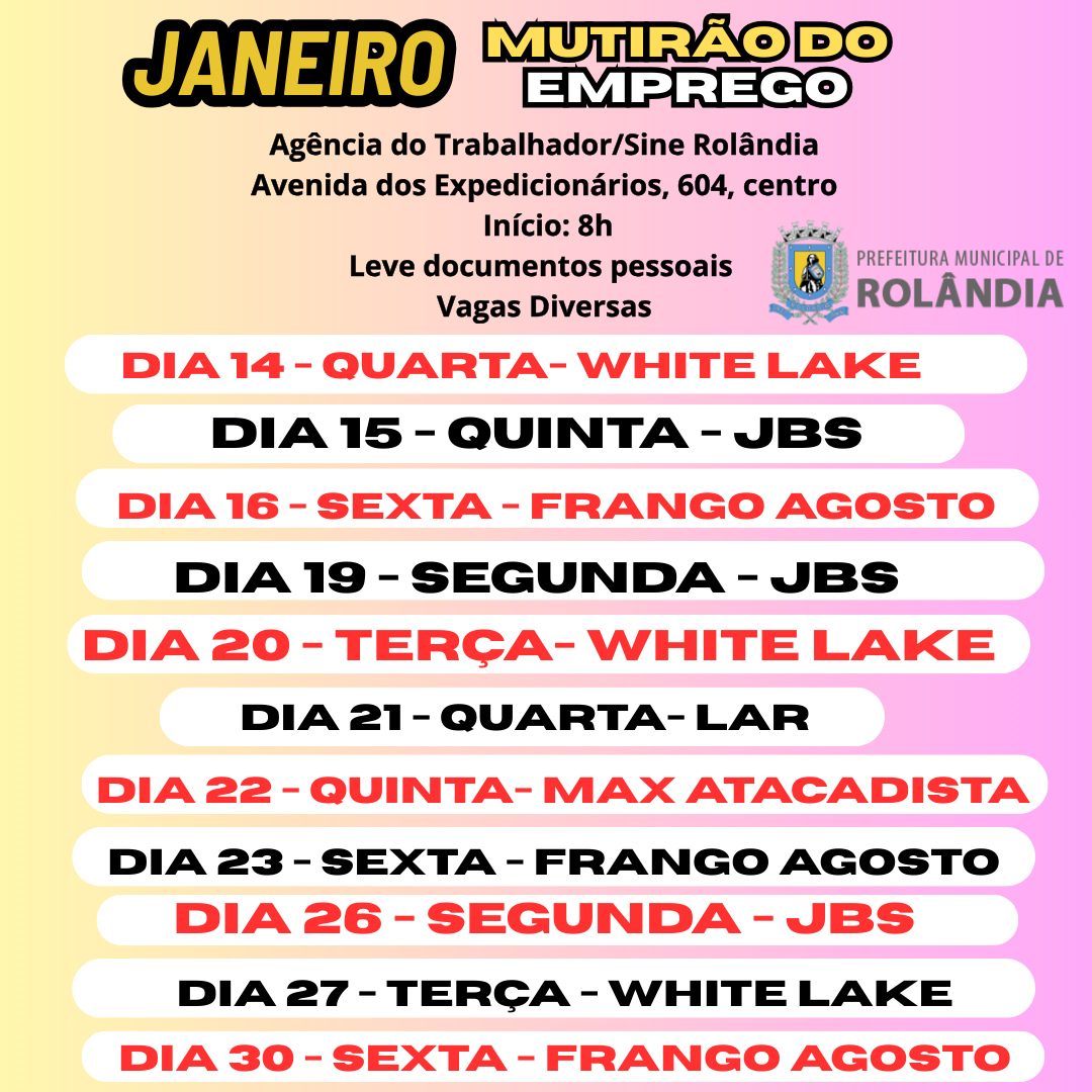 Vagas de Emprego/Sine Rolândia- 08/01/26 1. Agente de inspeção qualidade/SIF/JBS/SEARA 2. Ajudante de carga e descarga 3. Ajudante de cozinha/JBS/SEARA 4. Ajudante de eletricista 5. Almoxarife 6. Atendente de lan...