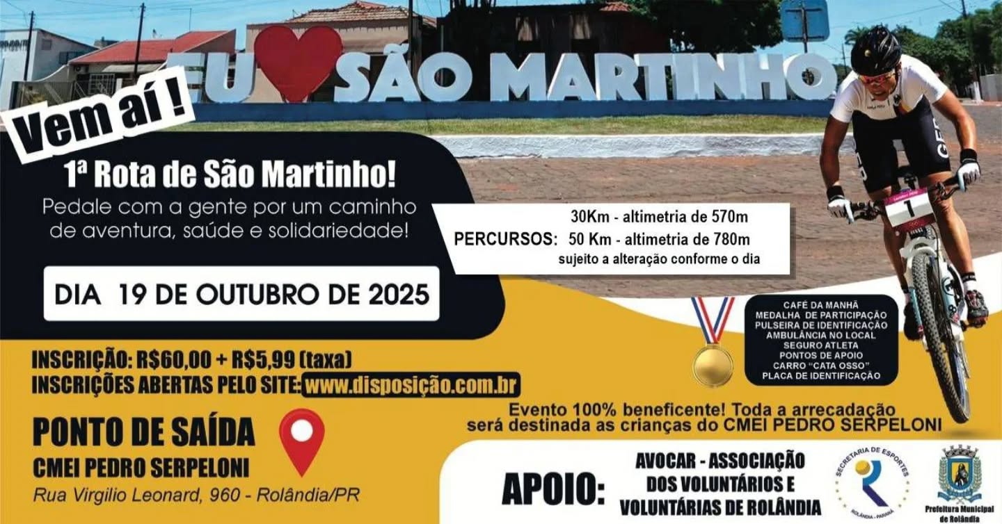 Vem aí "1° Rota de São Martinho"   A secretaria de Esportes informa sobre um grande evento que reúne saúde, turismo, solidariedade e prática esportiva!   No dia 19 de outubro de 2025, S&a...
