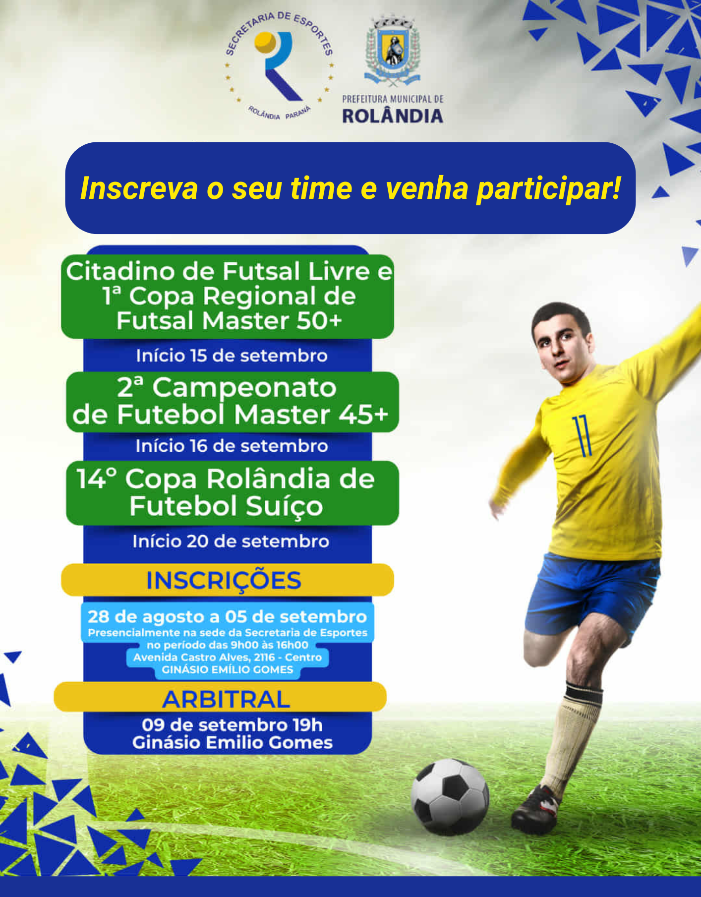 Inscrições abertas para grandes eventos esportivos em Rolândia!   A secretaria de Esportes informa e convida para:   Citadino de Futsal Livre + 1ª Copa Regional de Futsal Master 50+ ( Início 15/...