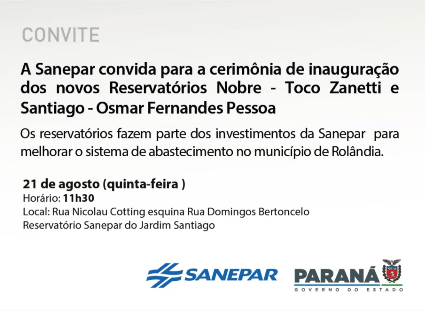 SANEPAR INAUGURA DOIS RESERVATÓRIOS QUE VÃO AUMENTAR EM 35% A CAPACIDADE DO SISTEMA DE ABASTECIMENTO DE ROLÂNDIA Nesta quinta-feira, dia 21 de agosto, às 11h30, o diretor-presidente da SANEPAR, Wilson Bley, estará...
