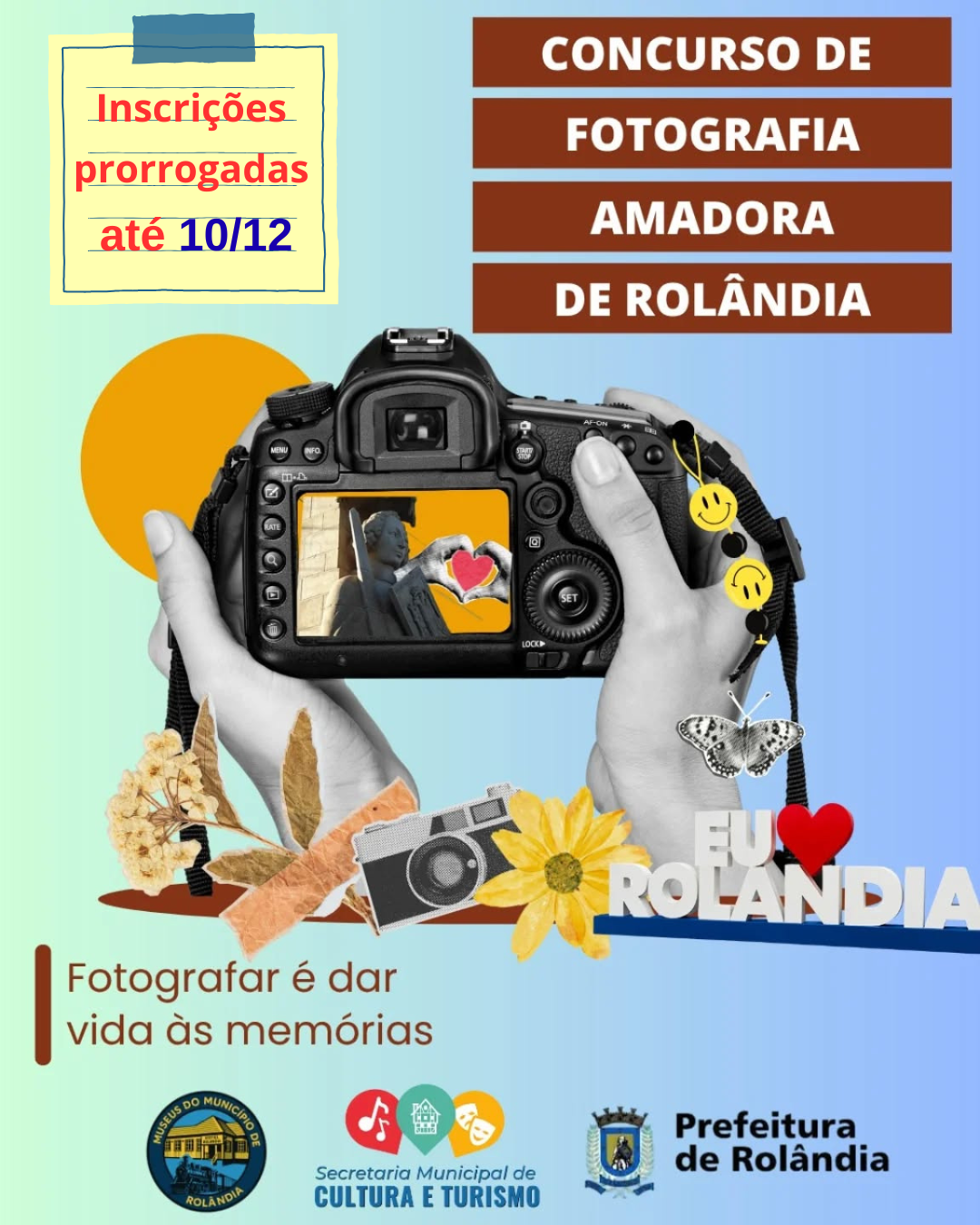 Inscrições para Concurso Fotográfico foram prorrogadas até 10/12   A secretaria de Cultura e Turismo lança um desafio.   A ideia é simples: cada morador de Rolândia registra, em um...