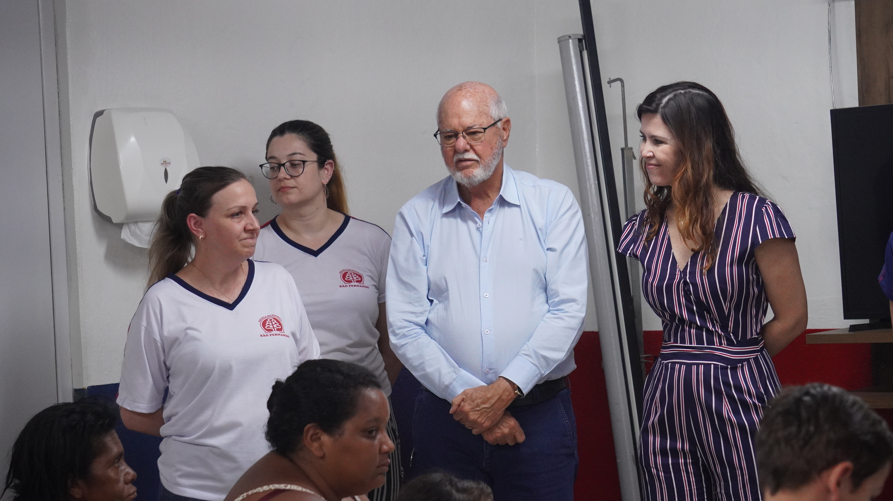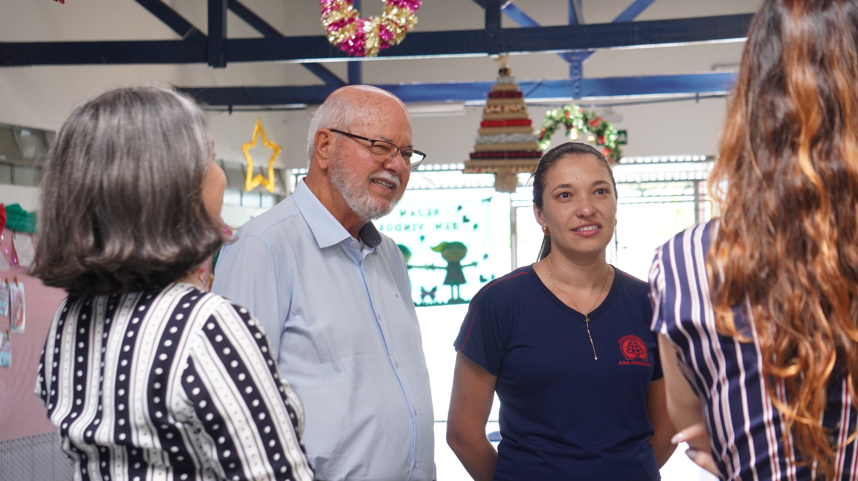 O prefeito Ailton Maistro, a secretária de Educação, Leise Camargo, a diretora da secretaria de Educação, Silvana Negrão e a gerente de Educação Infantil, Natália Ipojuca forma conferir o projeto “contação de história” dos alunos do infantil 05 do CMEI Hans Helmut.