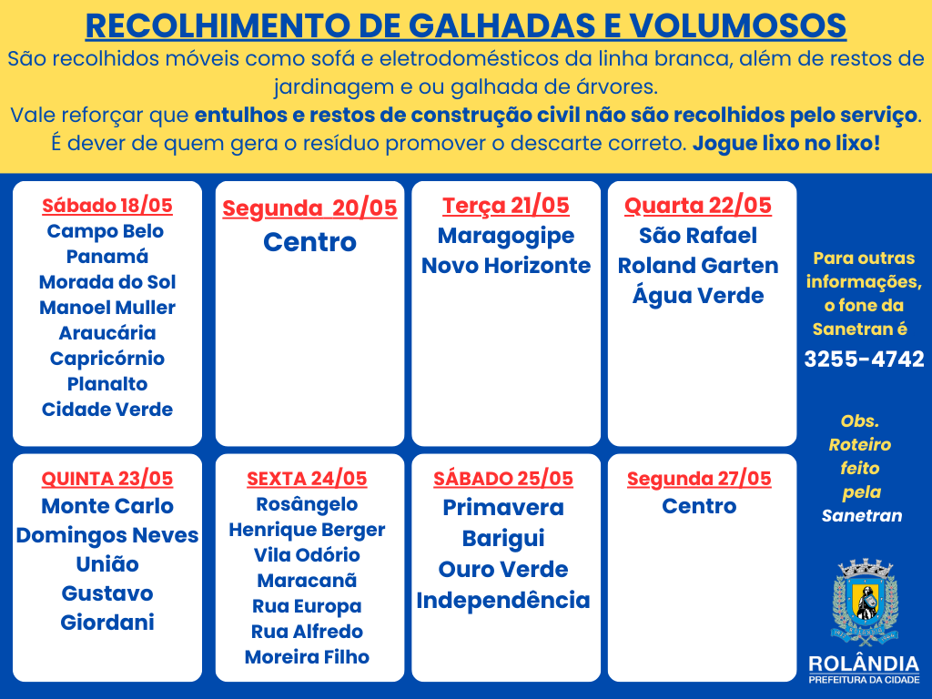 As Secretarias de Serviços Públicos e de Agricultura e Meio Ambiente informam que a empresa terceirizada que presta serviço ao município, a SANETRAN, faz a divulgação das regiões em que vai passar recolhendo volumosos deixados na calçada (móveis como sofá e eletrodomésticos da linha branca), além de restos de jardinagem e ou galhada de árvores.
