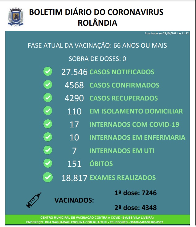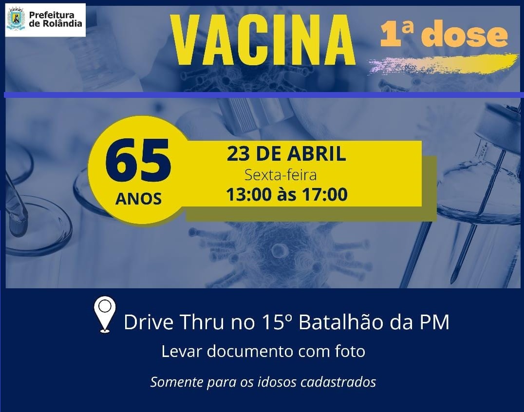 A Secretaria Municipal de Saúde informa que o inÃcio da vacinação (primeira dose) contra a covid-19 nas pessoas com 65 anos ou mais será na sexta-feira, dia 23 de abril, em Drive Thru no pátio do 15° Batalhão, das 13h à s 17h.Somente idosos c...