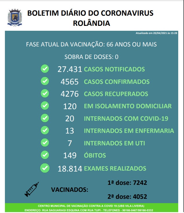 A Secretaria Municipal de Saúde informa que nesta quarta-feira, dia 21 de abril, feriado de Tiradentes, serão duas ações para vacinação contra a covid-19, em Drive Thru, no pátio do 15º Batalhão da Polícia Militar: DAS 8H ÀS 12H VACINA...