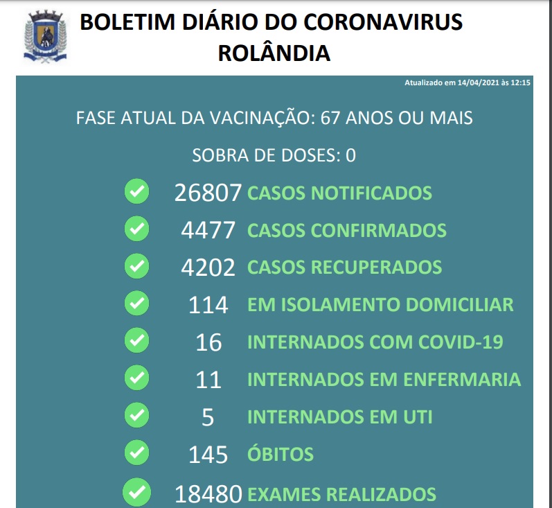 Além dos nove dias consecutivos de Drive Thru de vacinas (dois já foram), segue a vacinação agendada de idosos no Centro Municipal de Vacinação contra a Covid-19, na rua Tupi, na Vila Oliveira.Rolândia está vacinando a população 67 ou mais!...