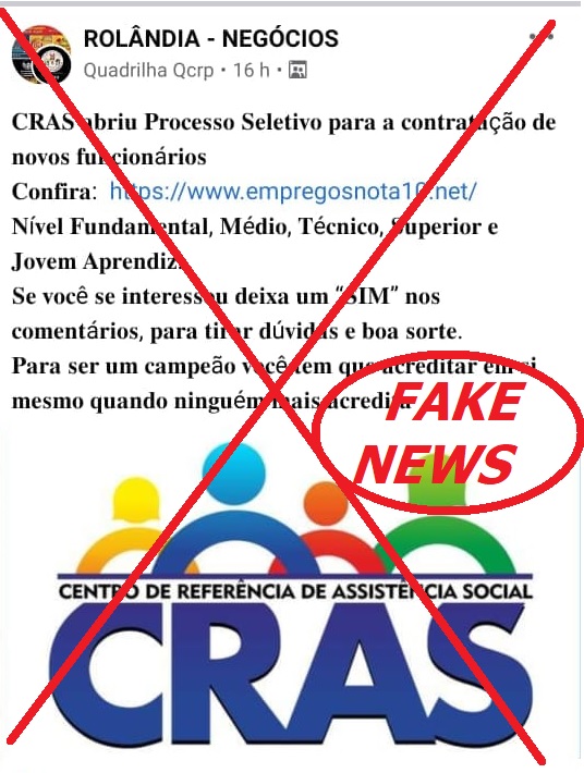 A Secretaria de Assistência Social alerta a população para que não passe seus dados nem preencha nenhum formulário a respeito de uma notícia de contratação de pessoas para o CRAS de Rolândia.Isso é fakenews!É golpe! O Secretário Diego ...