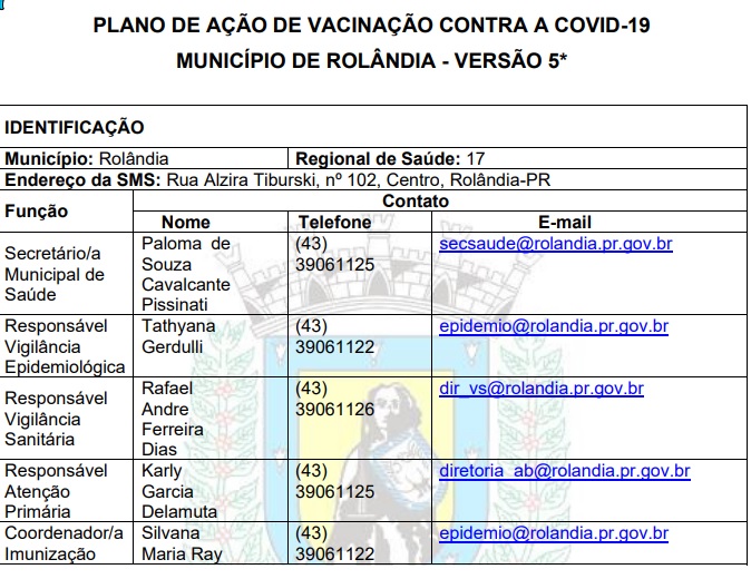 A Secretaria de Saúde publicou nesta sexta-feira, dia cinco de março, a atualização do "Plano de Ação de Vacinação contra a covid-19 do município de Rolândia". Confira a íntegra do documento no arquivo em anexo....