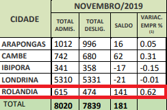 De acordo com o Cadastro Geral de Empregados e Desempregados (CAGED), o emprego formal no Brasil apresentou expansão em Novembro de 2019 e Rolândia liderou o quesito na Região Metropolitana de Londrina - com 141 novos postos de trabalho. O...