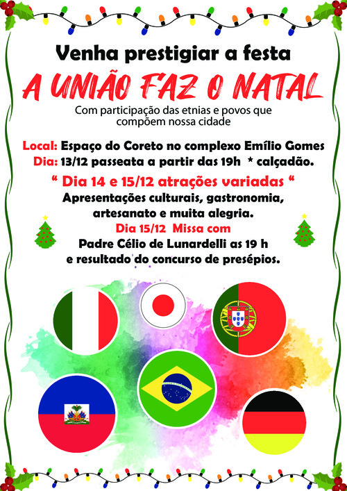 A Associação de Festas Culturais de Rolândia, com apoio da Prefeitura por meio da Secretaria de Cultura e Turismo e demais Secretarias, vai promover nos dias 13, 14 e 15 de dezembro (sexta, sábado e domingo) o evento “ A UNIÃO FAZ O NATAL”...