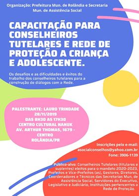 No dia 28 de novembro Rolândia vai sediar no Centro Cultural Nanuk, uma capacitação para os novos Conselheiros Tutelares eleitos para Rolândia e municípios da região. O palestrante será Lauro Trindade: Ex-Conselheiro Tutelar por dois mandato...