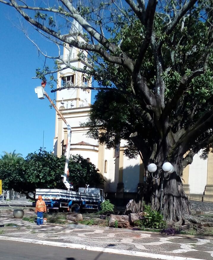 A Secretaria de Agricultura e Meio Ambiente e a empresa terceirizada Sanetran intensificaram o trabalho de poda e remoção de árvores na cidade. Aqui o serviço feito na praça da Igreja Matriz....