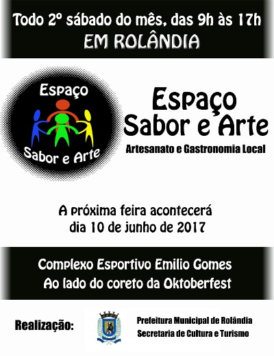 Neste sábado, dia 10 de junho, a Secretaria de Cultura e Turismo promove mais uma edição do "Espaço Sabor e Arte", um local destinado à venda de artesanato e produtos gastronômicos do Município de Rolândia. A feira acontece n...