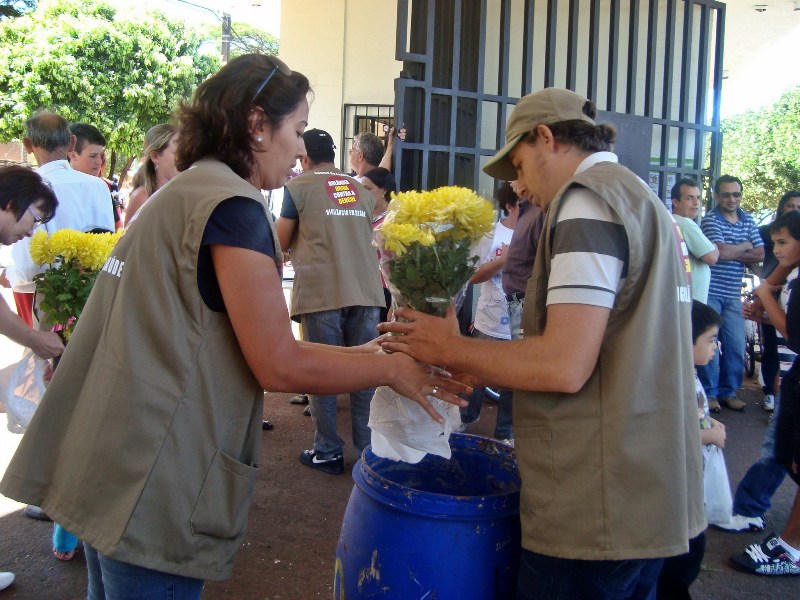 Durante todo o dia, os profissionais orientaram a população, distribuíram panfletos e retiraram os plásticos que envolvem as flores. Uma tenda da Secretaria de Saúde foi montada com demonstração de larvas do Aedes aegypti e sobre a formaç...