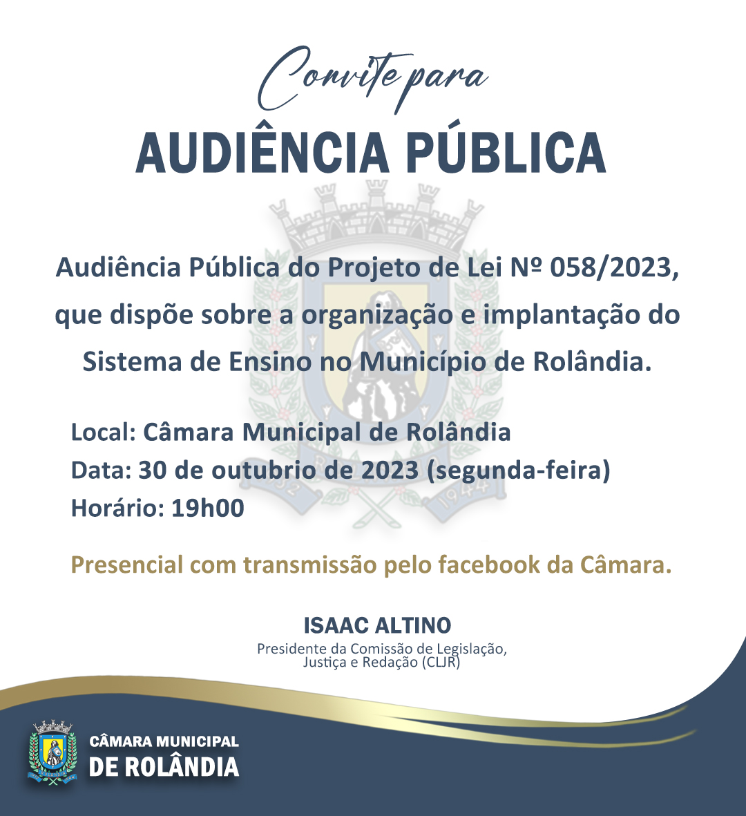 AUDIÊNCIA PÚBLICA DIA 30 DISCUTE O "SISTEMA DE ENSINO NO MUNICÍPIO DE ROLÂNDIA" A secretaria de Educação e a Câmara Municipal de Rolândia, através da Comissão de Legislação, Justiça e Redação (CLJR) por meio de seu presidente Isaac Al...
