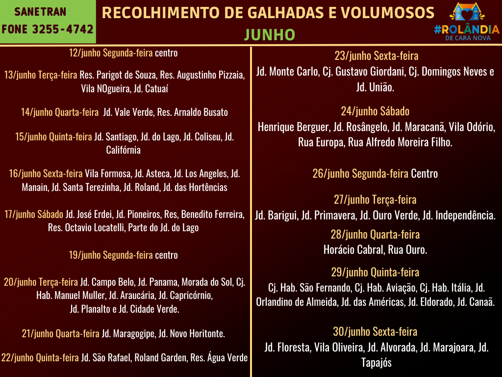AGENDA DA SANETRAN PARA RECOLHER GALHADAS E VOLUMOSOS -JUNHOA Secretaria de Agricultura e Meio Ambiente informa que a empresa terceirizada que presta serviço ao município, a SANETRAN, faz a divulgação das regiões em que vai passar recolhendo vol...