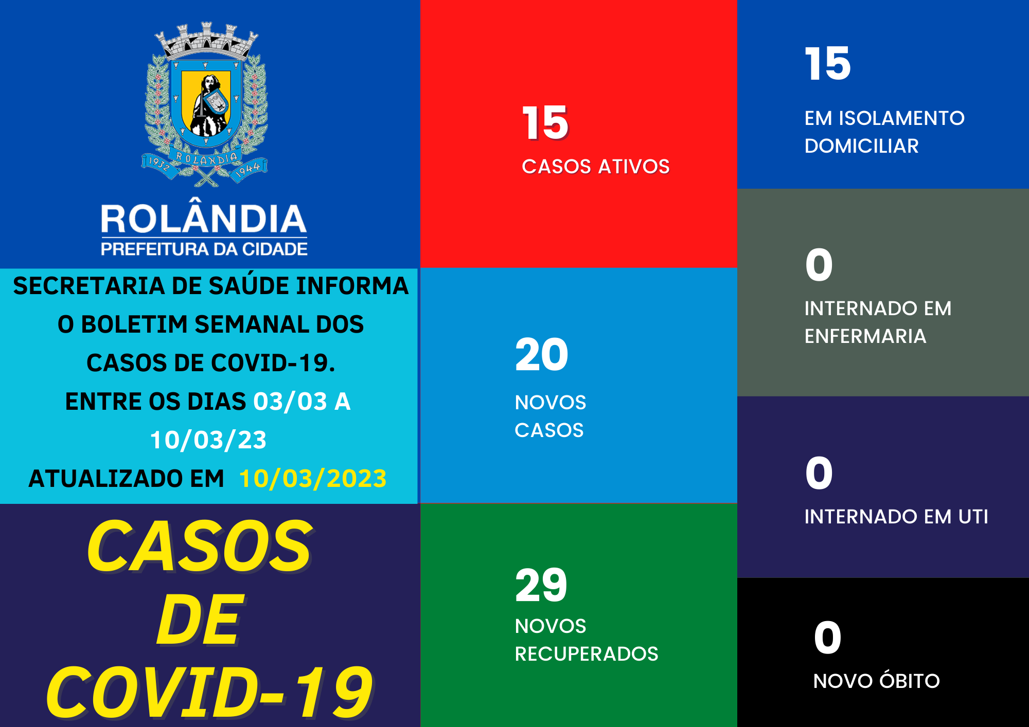 BOLETIM COVID-19A secretaria municipal de Saúde informa sobre os casos de covid-19, entre os dias 03 a 10/03 de 2023. Na atualização do boletim, 20 contaminações e 29 pacientes curados. Rolândia tem 15 pacientes com covid-19, todos em isolamen...